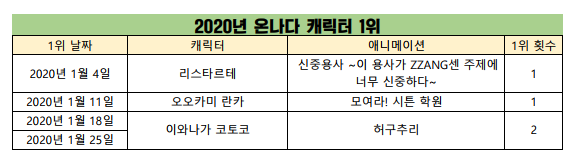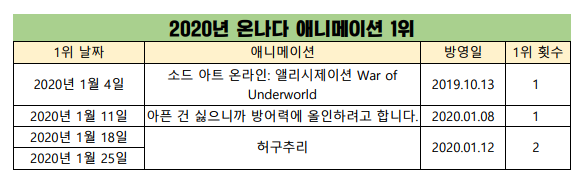 2020년 1월 25일자 온나다 종합차트입니다.