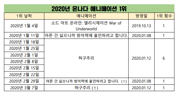 세차트 모두 정상에 오를일은 드물텐데 이정도면 꽤 인기가 있는 작품인가 보네요~