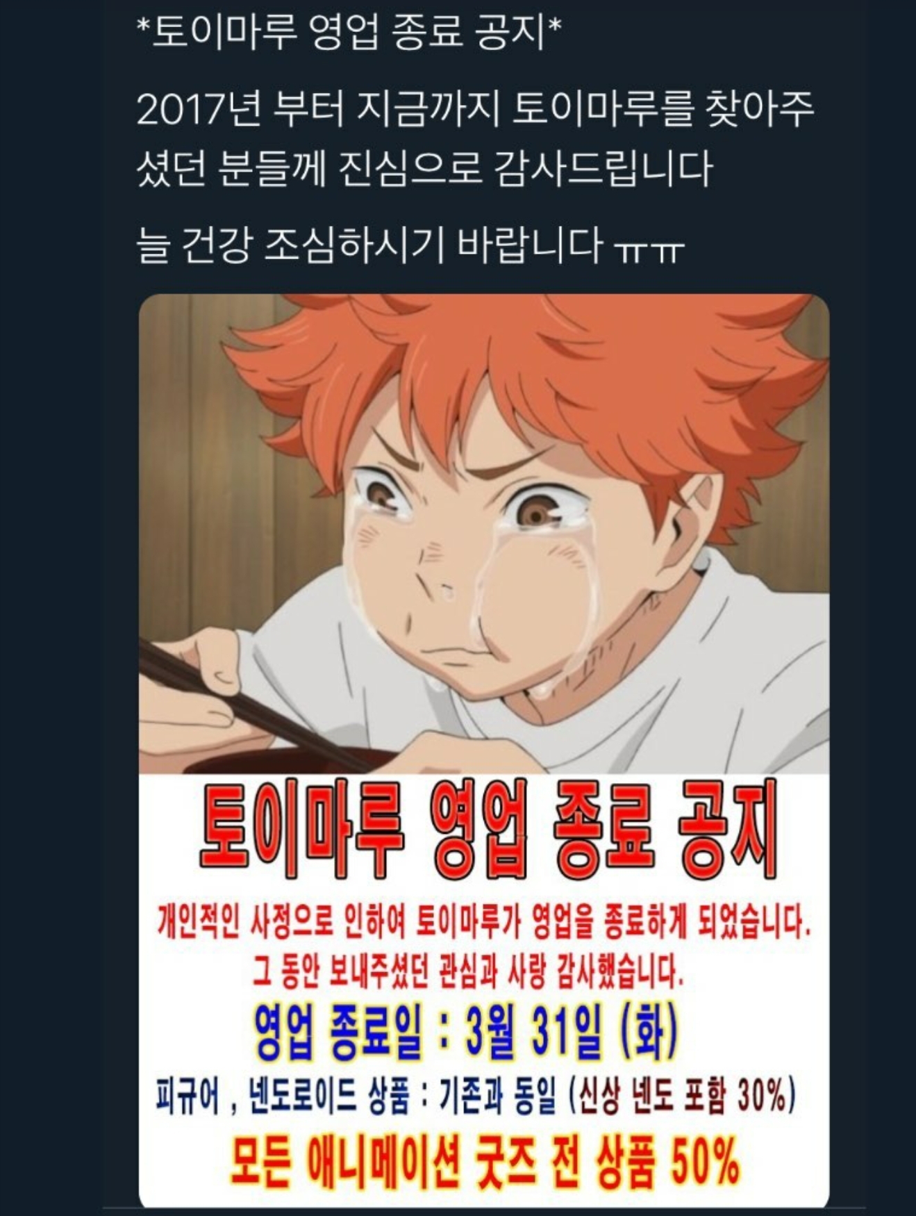 TMTonejae 또 떠나보내는군요 [일반] 작성일시 : 2020. 03. 11 (22:11) 조회 : 2,406 / 댓글 : 6 홍대입구역 앞에 위치한 홍대 토이마루가개인적인 사정으로 이번 달을 끝으로 문을 닫는다고 하네요 사실 홍대에서 덕질하러 갈 때 자주 가던 곳이고또한 덕친과는 필수 코스라 정도 많았고구매한 굿즈도 꽤 있어서슬프네요 ㅜㅜ 영업 종료 전에 코로나 뚫고작별인사하고 싶네요 ㅜㅜ 사실 아는 지인이 올려서바로 충격 먹었답니다 ㅜㅜ 9추천 글쓰기스크랩 신고