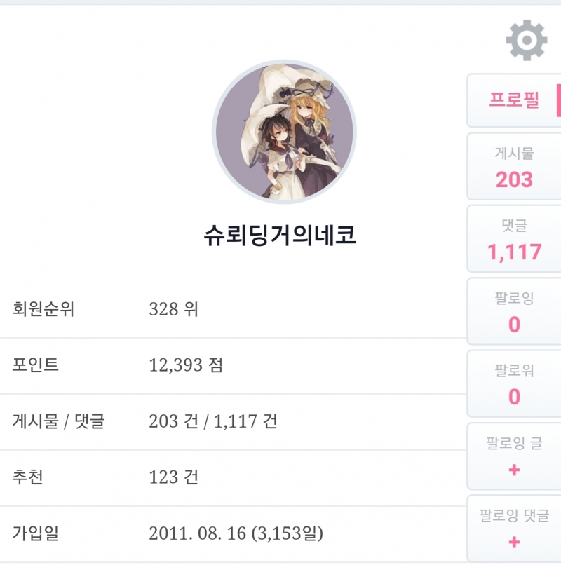 슈뢰딩거의네코 그아아앗 3153일의 스택의 힘이 느껴지십니까 [일반] 작성일시 : 2020. 04. 02 (22:14) 조회 : 2,418 / 댓글 : 9 그아아아아앗 7추천 글쓰기스크랩 신고