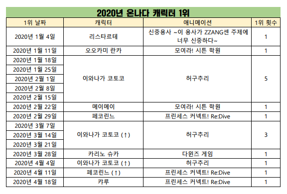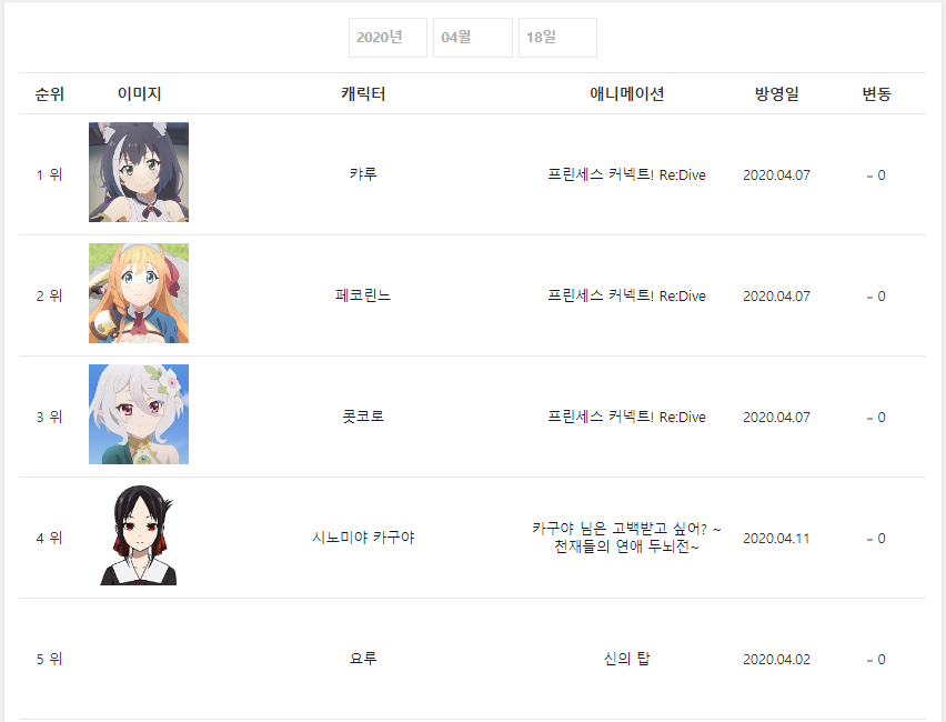 캐릭터 차트는 1~3위 모두 프리코네 캐릭터들이 차지했네요