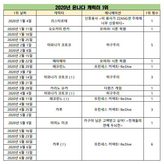 현재 1위 : 이와나가 코토코 (허구추리), 캬루 (프린세스 커넥트! Re:Dive) [9주]