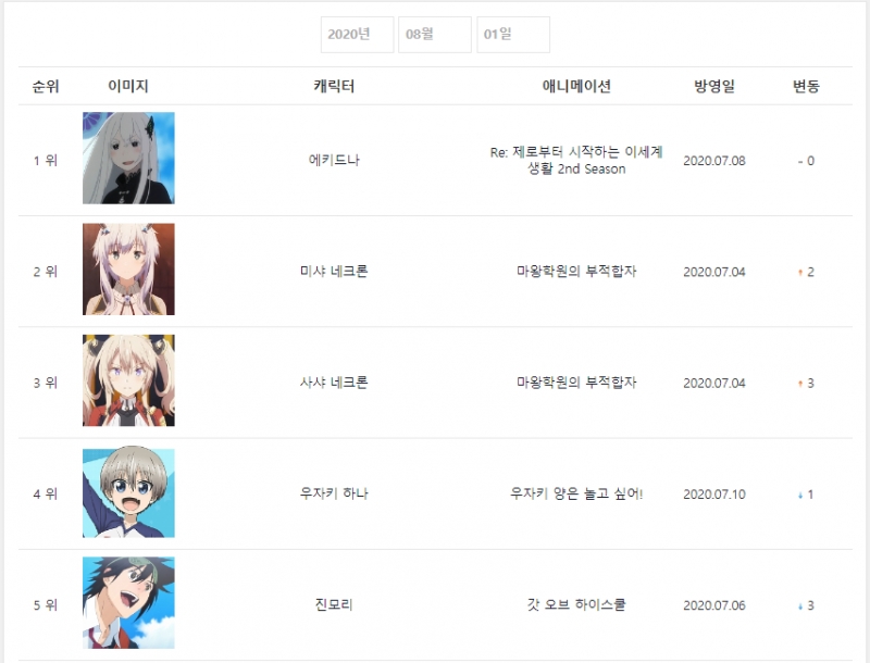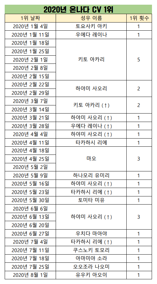 2020년 8월 1일자 온나다 종합차트입니다.