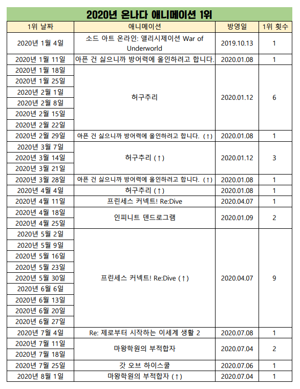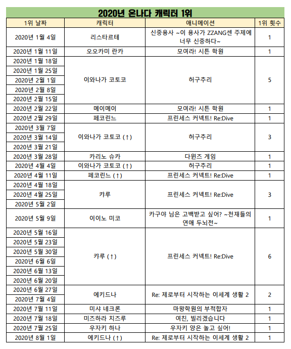 현재 1위 : 허구추리 (2020.01.12), 프린세스 커넥트! Re:Dive (2020.04.07)