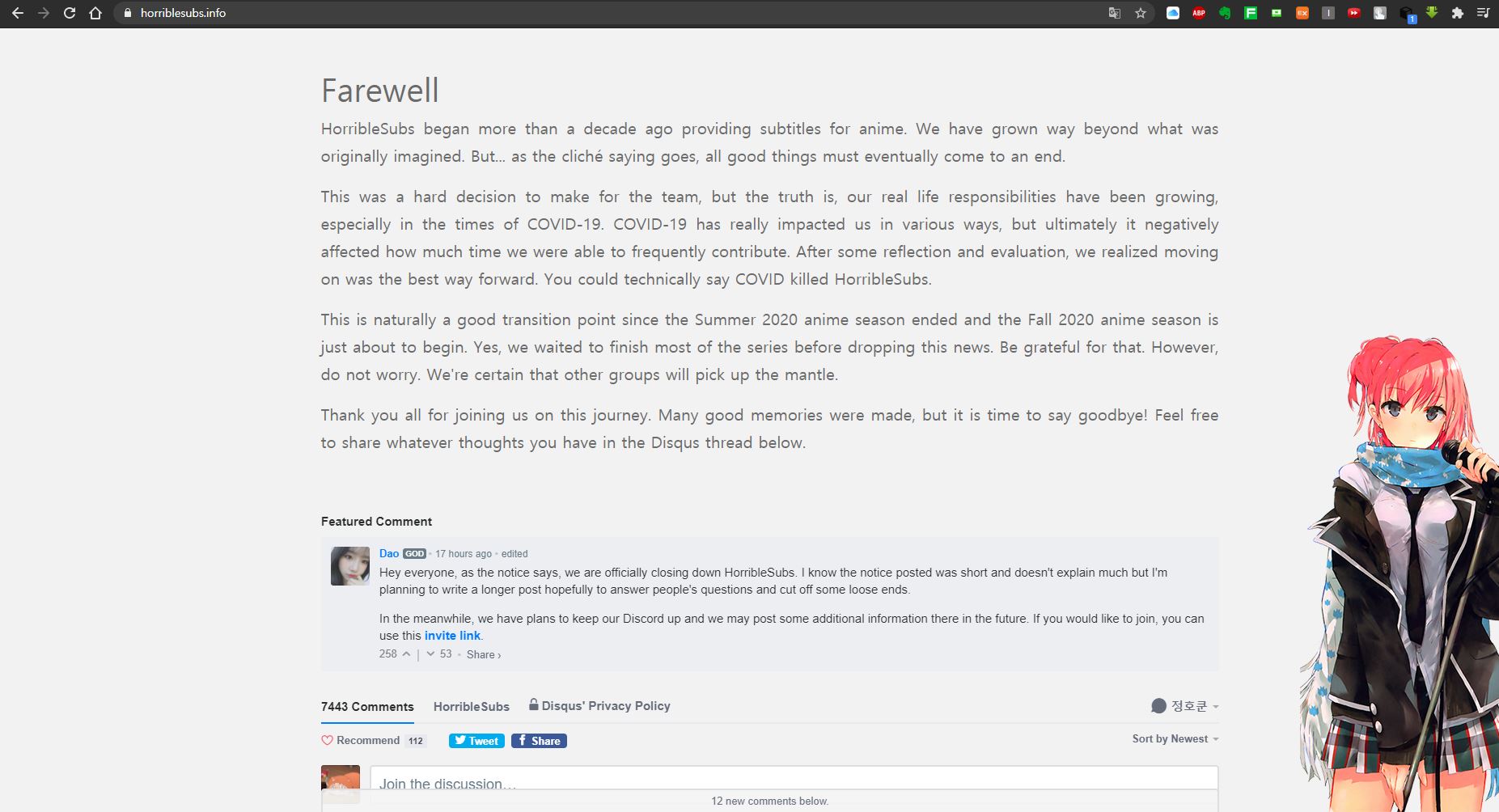 주문토끼 혹시 애니 어디서들 보시나요? [일반] 작성일시 : 2020. 10. 03 (05:30) 조회 : 3,131 / 댓글 : 15 전 맨날 horriblesub 에서 1080p 토렌트 다운받아서 봣었는데 이제 더 이상 업로드를 하지 않는다네요 ㅠㅠ..1080p에 영어자막도 포함이라 좋았었는데 아쉽네요kissanime 라는 곳에서 스트리밍으로 보기도 했었는데 여기도 문닫고 ㅠㅠ 1080p로 매주 애니 올라오는곳 없을까요? 5추천 글쓰기스크랩 신고