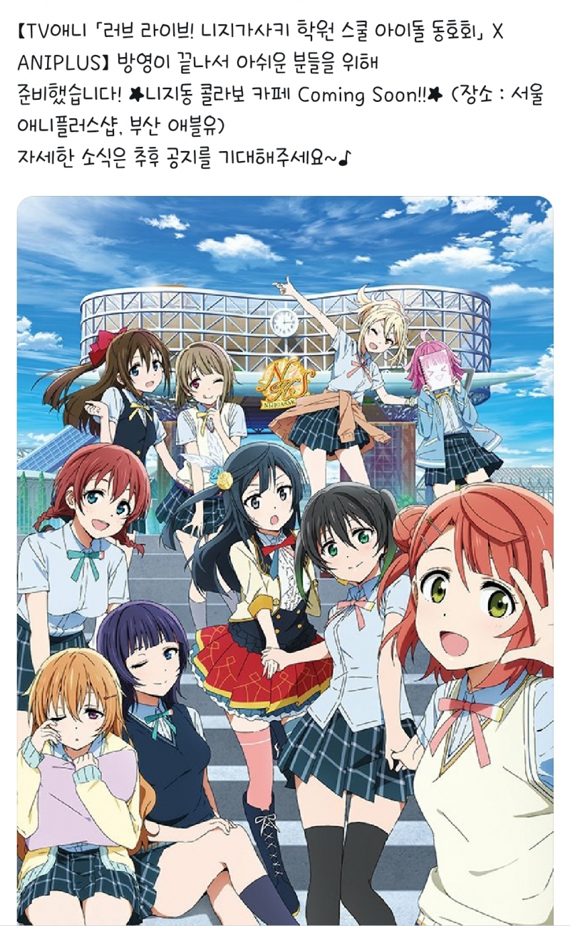 TMTonejae 2021년 새해에 애니플러스샵을 가야하는 이유가 생겼군요 [일반] 작성일시 : 2020. 12. 28 (09:11) 조회 : 2,453 / 댓글 : 9 럽라 니지동 애니가 완결되었는데애니플러스에서 아쉬움을 달래기위해2021년 새해에 서울 합정역 애니플러스샵과부산 애블유에서 니지동 콜라보를 할 예정이더군요 그 전에 빨리 코로나가 진정되어거리두기가 조금이라도 완화해야하는큰 산이 ㅠㅠㅠ 그러고보니 올해 초에도러브라이브 9주년 기념 콜라보 카페에 간 기억이새해는 역시 럽라로 시작하게 되네요 7추천 글쓰기스크랩 신고