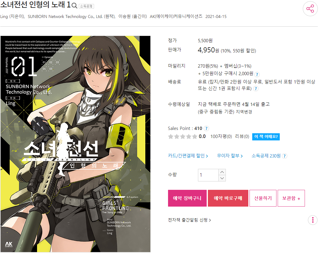평범한송 소녀전선 만화책이 정발했군요. [일반] 작성일시 : 2021. 04. 10 (12:31) 조회 : 2,494 / 댓글 : 3 알라딘에 새로 나온 만화책들을 찾다가 소녀전선 인형의 노래 만화책이 출간했더군요.소녀전선 스마트폰 게임으로 알고 있었지만 만화책도 있을 줄 몰랐네요. 3추천 글쓰기스크랩 신고
