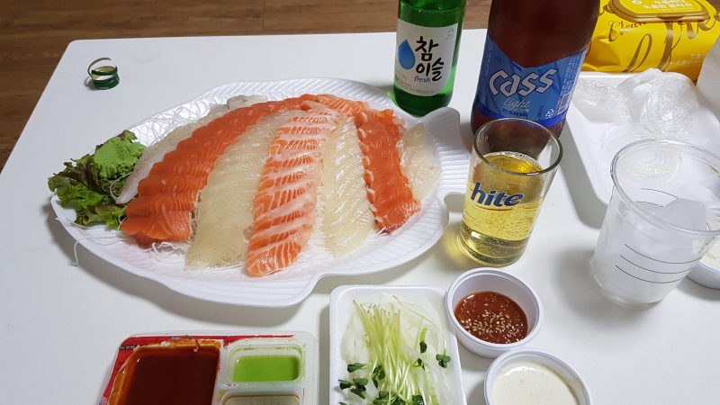 야식은 광어+연어+소맥 입니다