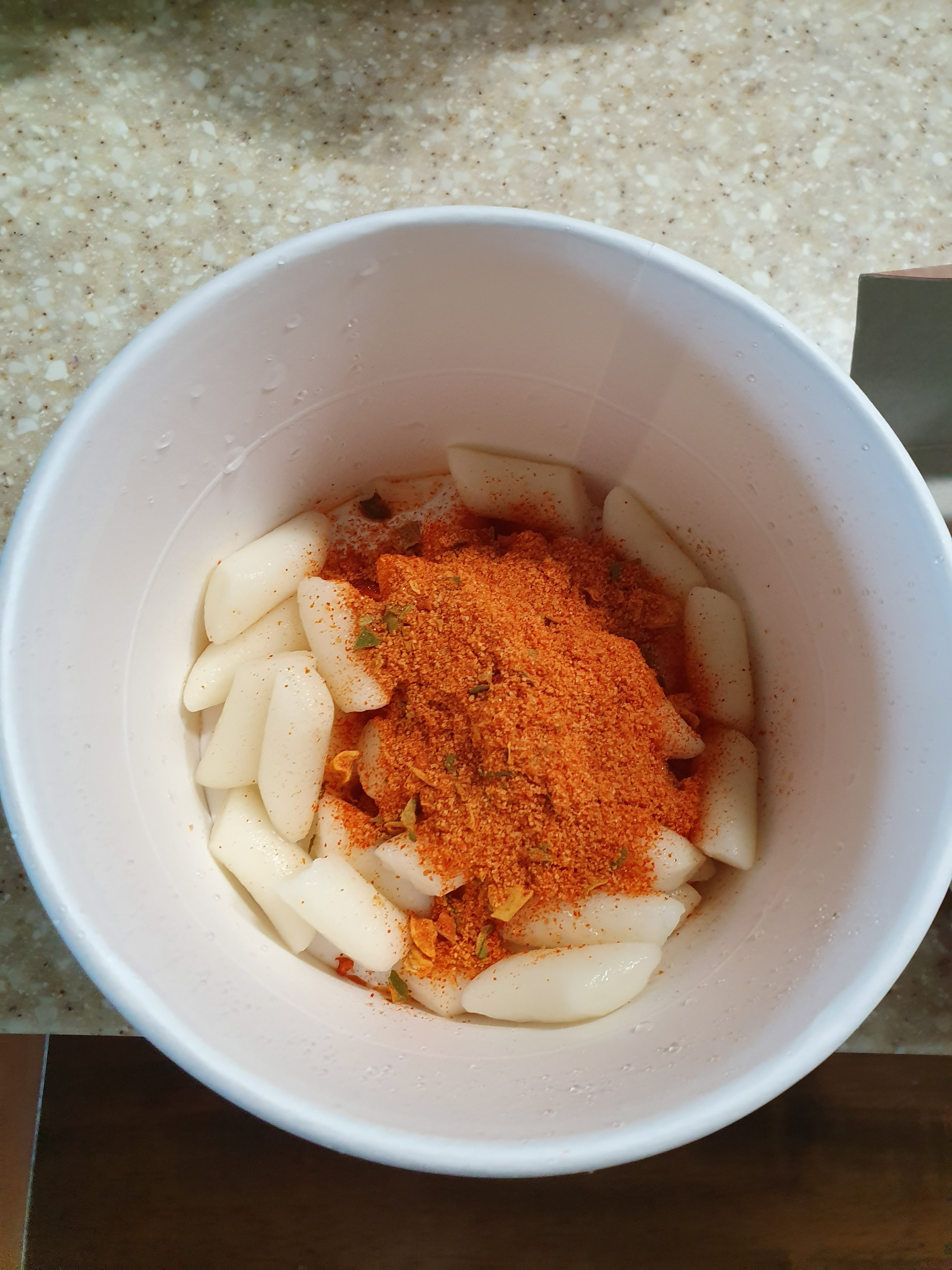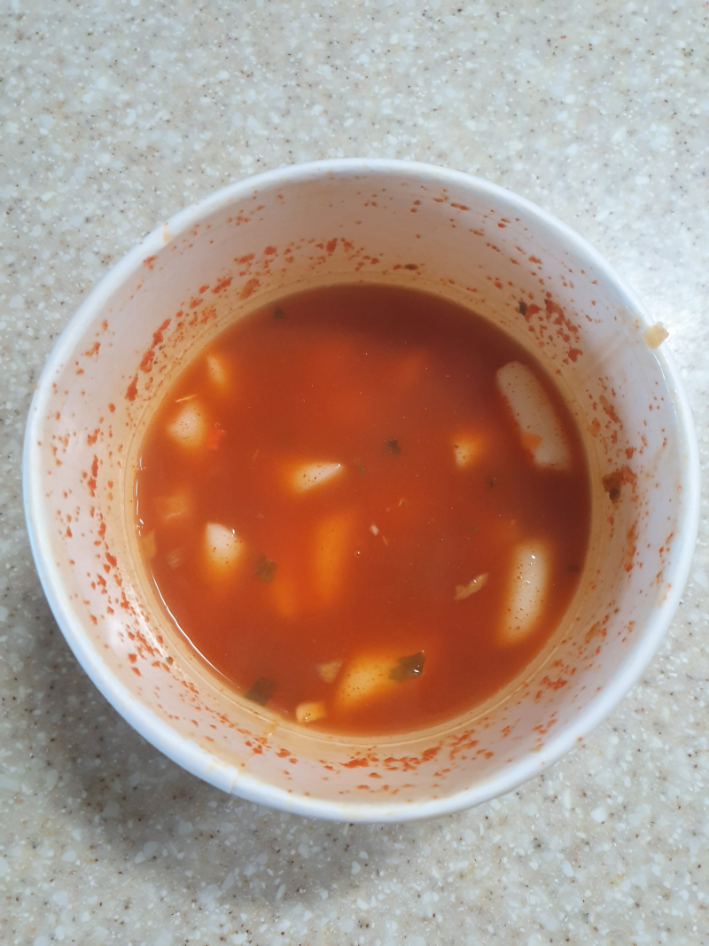 미스터스틱 점심에 먹었던 국물떡볶이 [일반] 작성일시 : 2021. 08. 14 (13:31) 조회 : 1,273 / 댓글 : 2 개봉전의 모습.떡만 들어있고 분말스프가 건더기스랑 섞여 있었고뜨거운 국물을 붓고 전자레인지에 2분 30초 돌렸더니 이렇게 되었습니다.오뎅이 없어서 아쉬웠지만 남은 국물은 밥말아먹는 걸로 마무리합니다.시간이 지날수록 밥도 걸쭉해졌네요. 8추천 글쓰기스크랩 신고