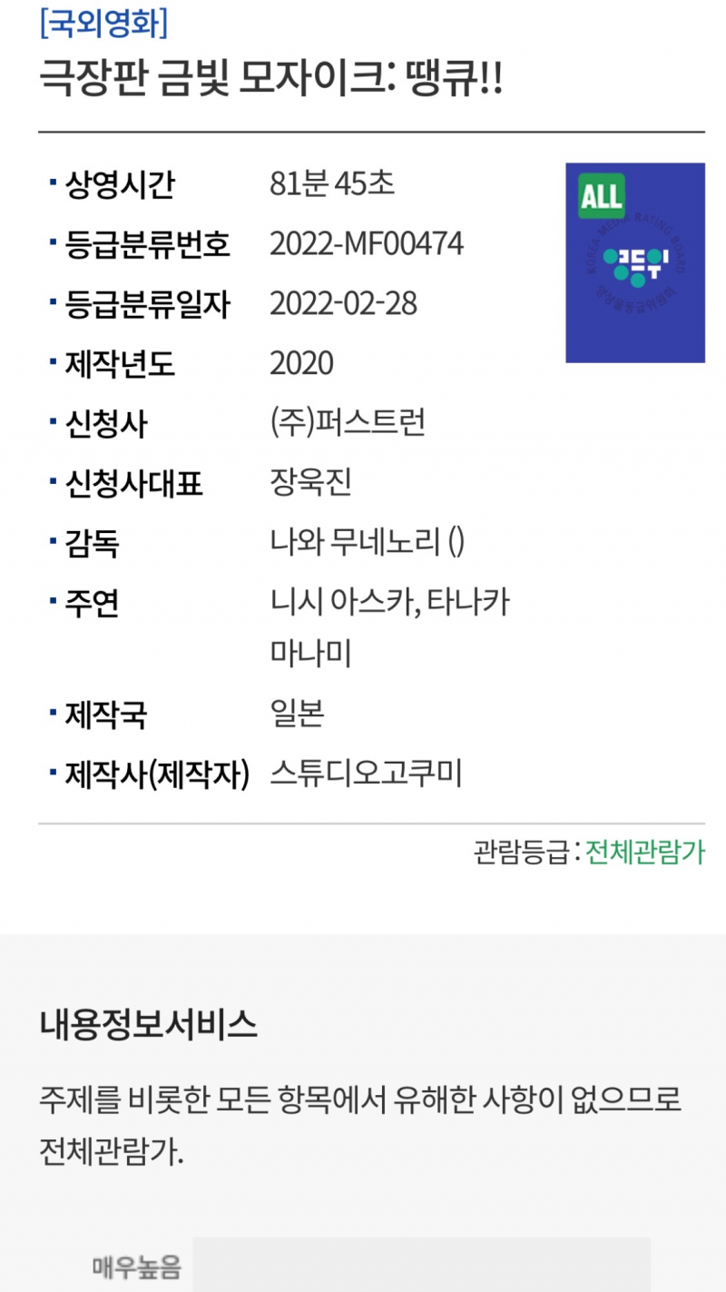 보라마키 금빛 모자이크 땡큐 전체관람가로 분류 확정 [애니] 작성일시 : 2022. 03. 01 (18:18) 조회 : 1,480 / 댓글 : 9 어제 막 등급분류가 완료되었다네요.전체관람가로 분류를 받았고, 금빛 모자이크 프리티 데이즈를 수입 배급했던 퍼스트런이 수입 배급을 맡았네요.이제 금빛 모자이크 땡큐가 무사히 한국에 개봉할 수 있으면 좋겠네요!! 7추천 글쓰기스크랩 신고