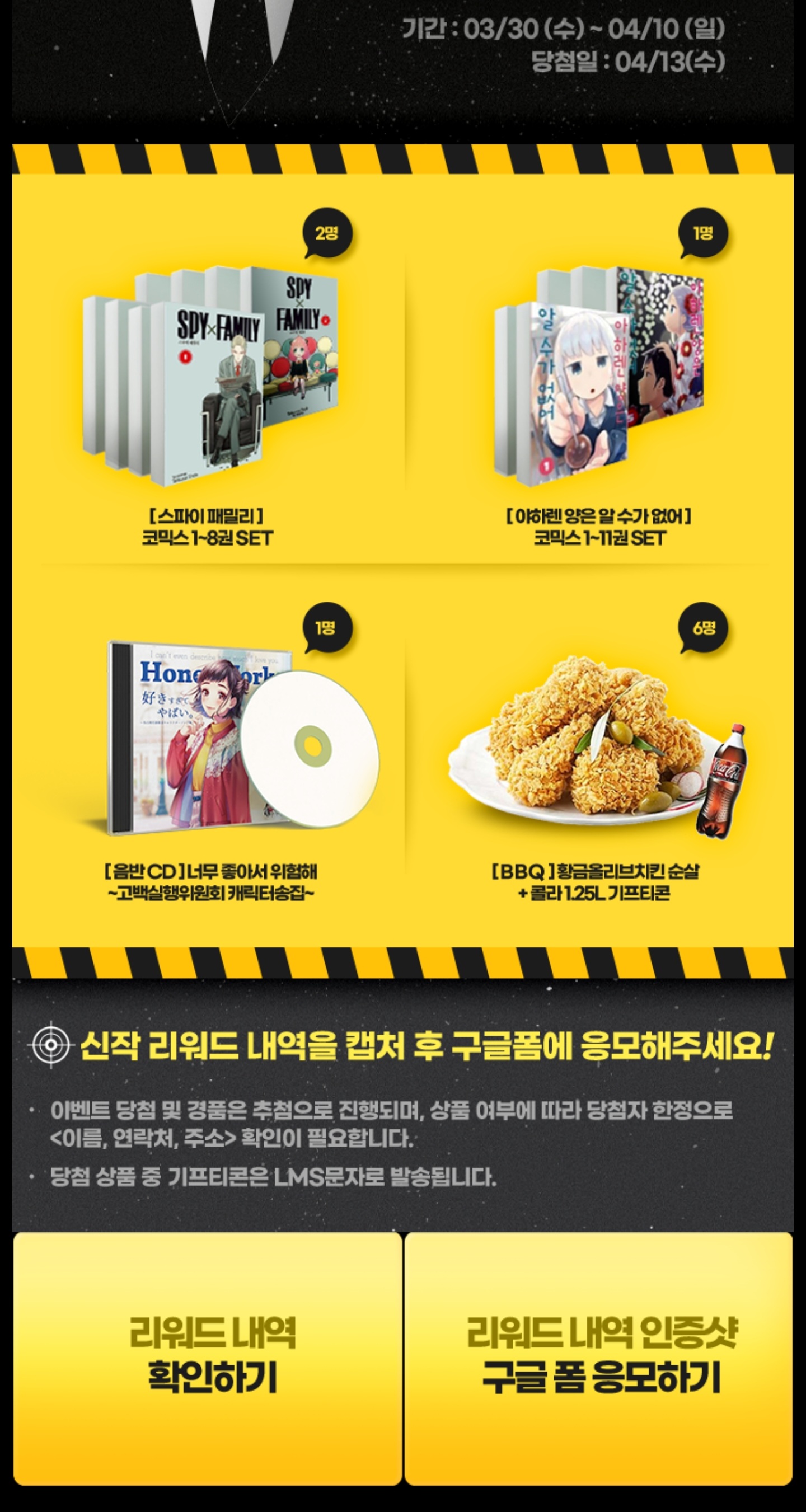 Ahoy 애니플러스 4월 이벤트중 입니다. [일반] 작성일시 : 2022. 04. 03 (19:53) 조회 : 1,431 / 댓글 : 1 https://www.aniplustv.com/event/299#경품 받아가세요! 6추천 글쓰기스크랩 신고