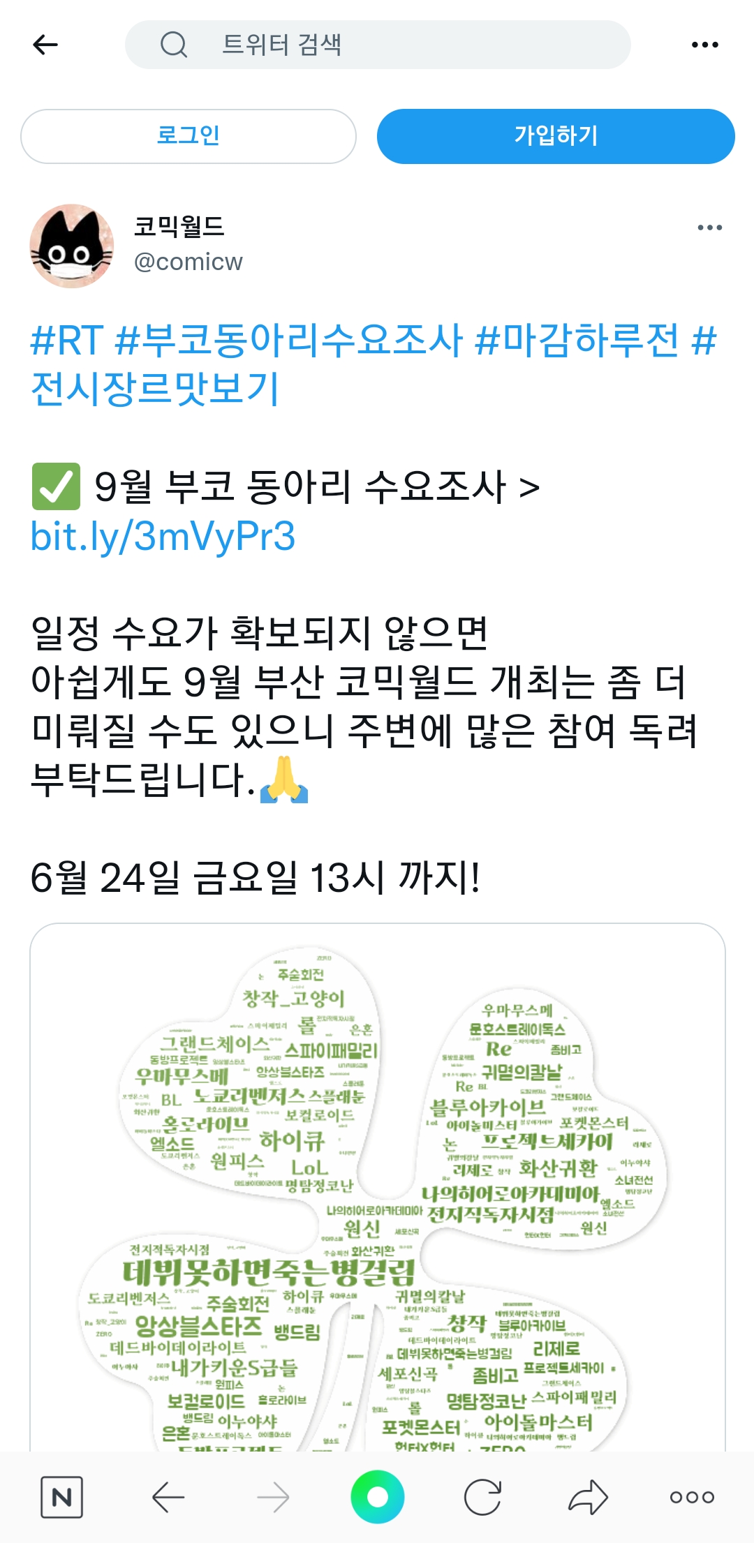 평범한송 9월 부산 코믹월드 개최 미뤄질 가능성이 있을 것 같군요. [일반] 작성일시 : 2022. 06. 23 (19:21) 조회 : 1,314 / 댓글 : 4 코믹월드 트위터에 글을 보니깐 9월 부산 코믹월드 동아리 수요조사 마감 기간이 내일 금요일까지라고 하는데요.글 내용 보시다시피 일정 수요가 확보되지 않으면 9월 부산 코믹월드 개최 미뤄질 가능성이 있을 것 같네요... 5추천 글쓰기스크랩 신고