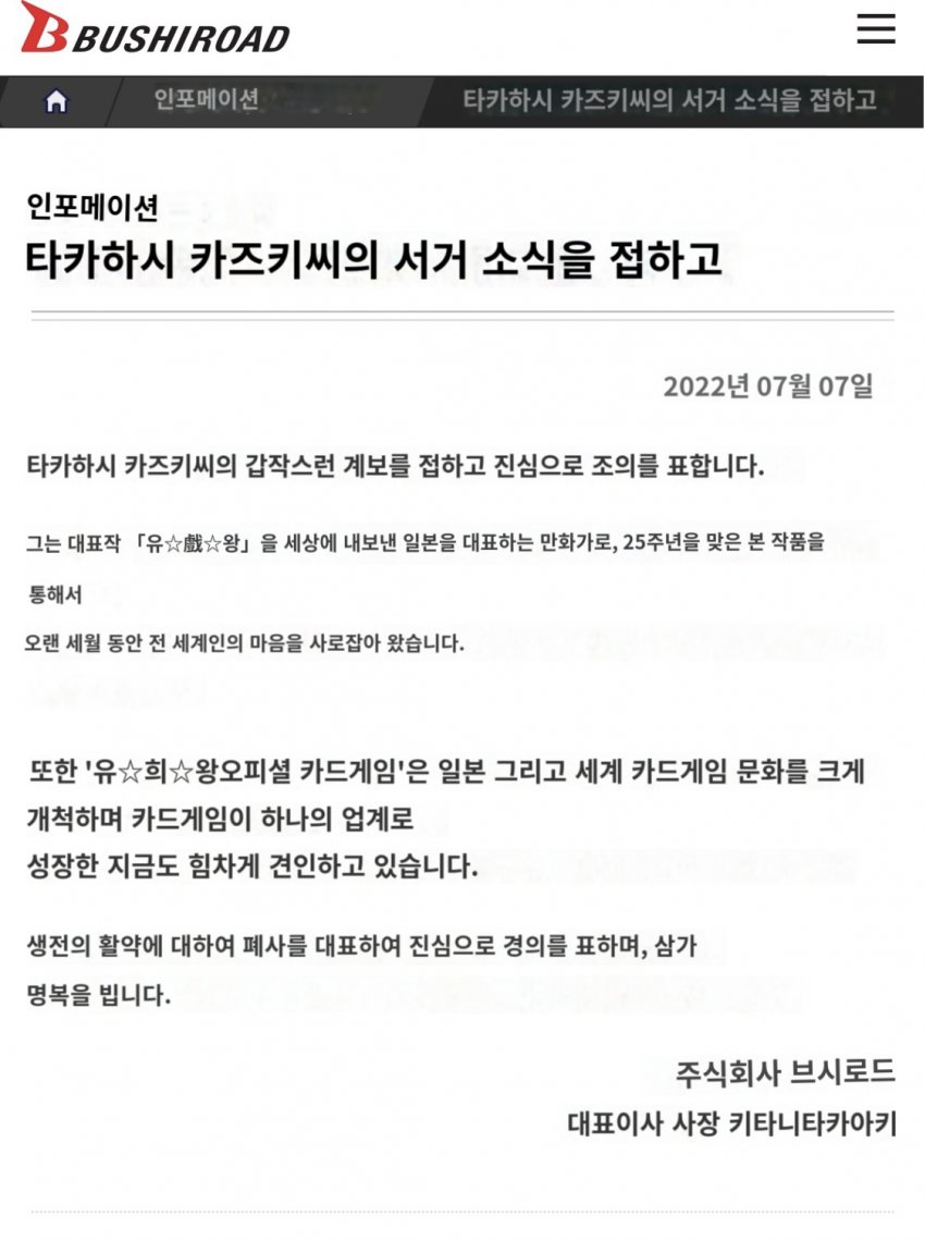 TMTonejae 만화 유희왕 작가 타카하시 카즈키씨의 명복을 빕니다 [일반] 작성일시 : 2022. 07. 07 (22:20) 조회 : 1,578 / 댓글 : 19 정말 갑작스런 비보네요제가 초중딩때 생애 첫 카드게임이었는데스노클링을 즐기다 익사로 인한 사망으로 추정되는데현지 경찰에서 정확한 조사가 진행 중이라고 합니다곧 우리나라도 휴가철이 코 앞인데다들 휴가가실 때 늘 안전하게즐기시길 바랍니다 9추천 글쓰기스크랩 신고
