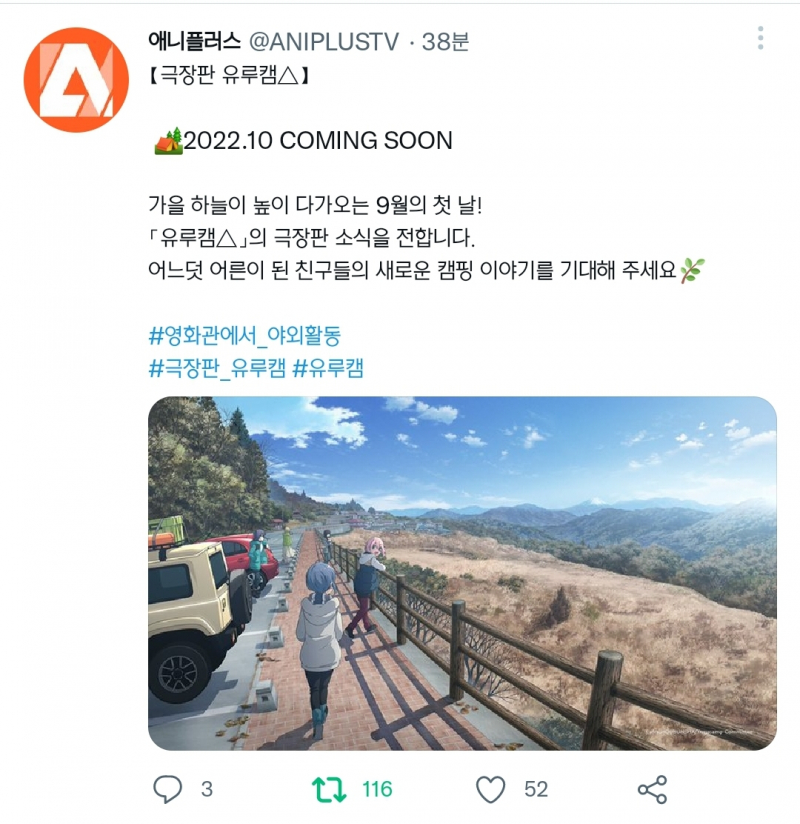 TMTonejae 극장판 유루캠 한국 개봉 확정 [일반] 작성일시 : 2022. 09. 01 (13:15) 조회 : 1,772 / 댓글 : 8 바로 가을과 겨울 사이를 느낄 수 있는10월에 개봉합니다이세콰르 극장판하고 같이 보겠네요이 애니가 밤에 보면 야식이 땡기는데극장이면 팝콘 라지나 각종 영화 매점메뉴와 음료를 흡입하겠군요!!! 8추천 글쓰기스크랩 신고