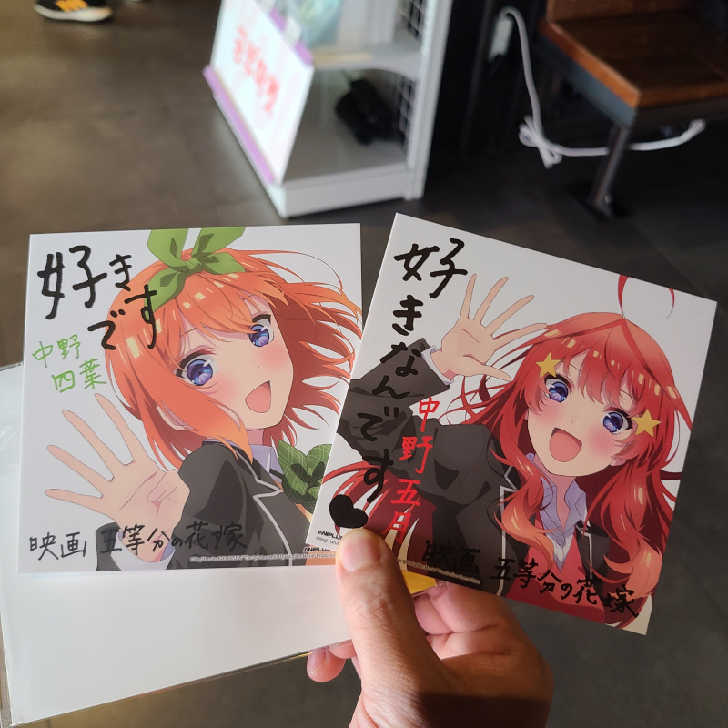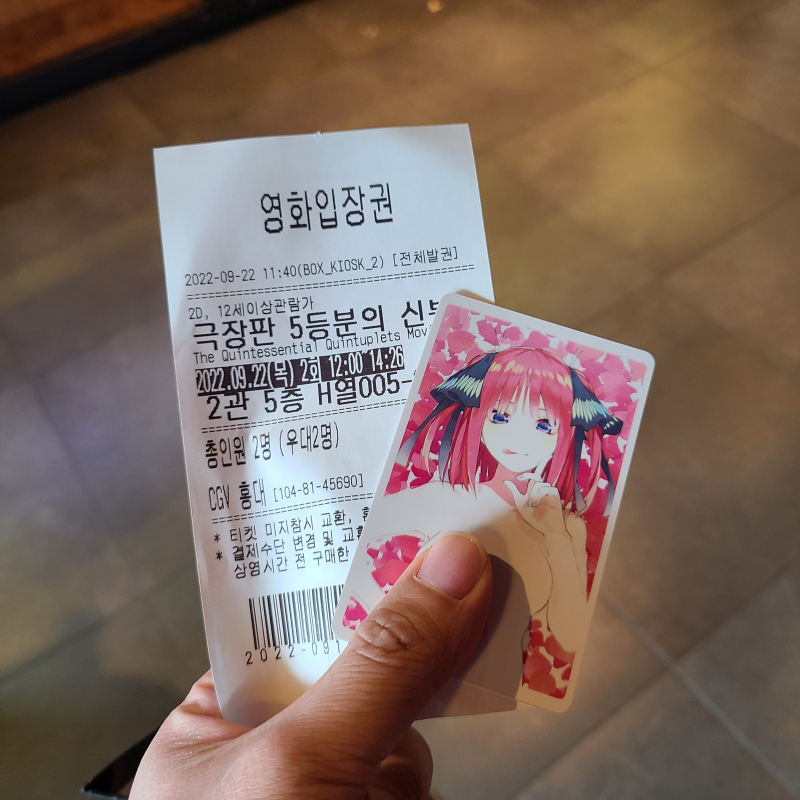 TMTonejae 행복한 덕질 투어였습니다 [일반] 작성일시 : 2022. 09. 22 (17:32) 조회 : 1,593 / 댓글 : 14 오늘 5등분의 신부 극장판 개봉해서개봉당일 지인이랑 보러 갔습니다특전은 관람 후에 받았는데이츠키와 요츠바네요우연히 같이 본 또 다른 지인 한 분 만나서홀로라이브 콜캎가고근처 스파게티 집에 가서 쉬림프 알리오 올리오먹었습니다이제 출근하러 가야겠네요 10추천 글쓰기스크랩 신고