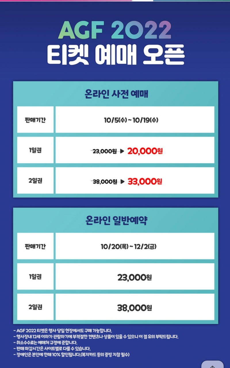 TMTonejae 드디어 큰 거 오는군요 [일반] 작성일시 : 2022. 10. 07 (15:20) 조회 : 1,763 / 댓글 : 8 일명 물품보관소 오타게 짤(?)로 유명한AGF가 코로나 이후 3년만에 개최하는데다음 주 수요일 인터파크를 통해예매 시작합니다3년 전엔 1만 7천원 정도였던 걸로 기억나는데물가 상승 등을 고려하면 나쁘지는 않지만아무래도 학생분들에겐 약 2달치 용돈을 아껴야 살 수 있는 약간의 부담이 있을 것 같네요3년 전에 재미있게 다녀온 터라안전하고 서로 배려하는 행사가 되었으면 좋겠어요 10추천 글쓰기스크랩 신고