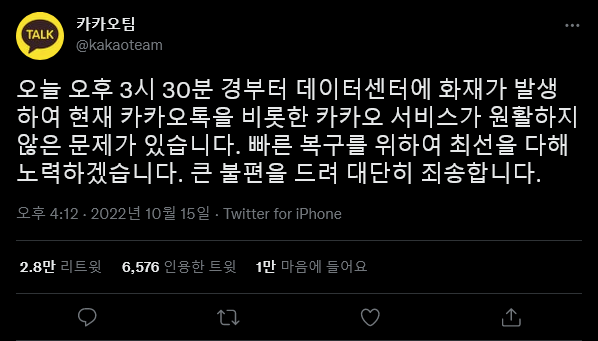 토모키 카카오 데이터센터 화재 [일반] 작성일시 : 2022. 10. 15 (17:56) 조회 : 1,375 / 댓글 : 12 카카오를 이용한 모든 서비스, 게임 조차도 안 되네요. 8추천 글쓰기스크랩 신고