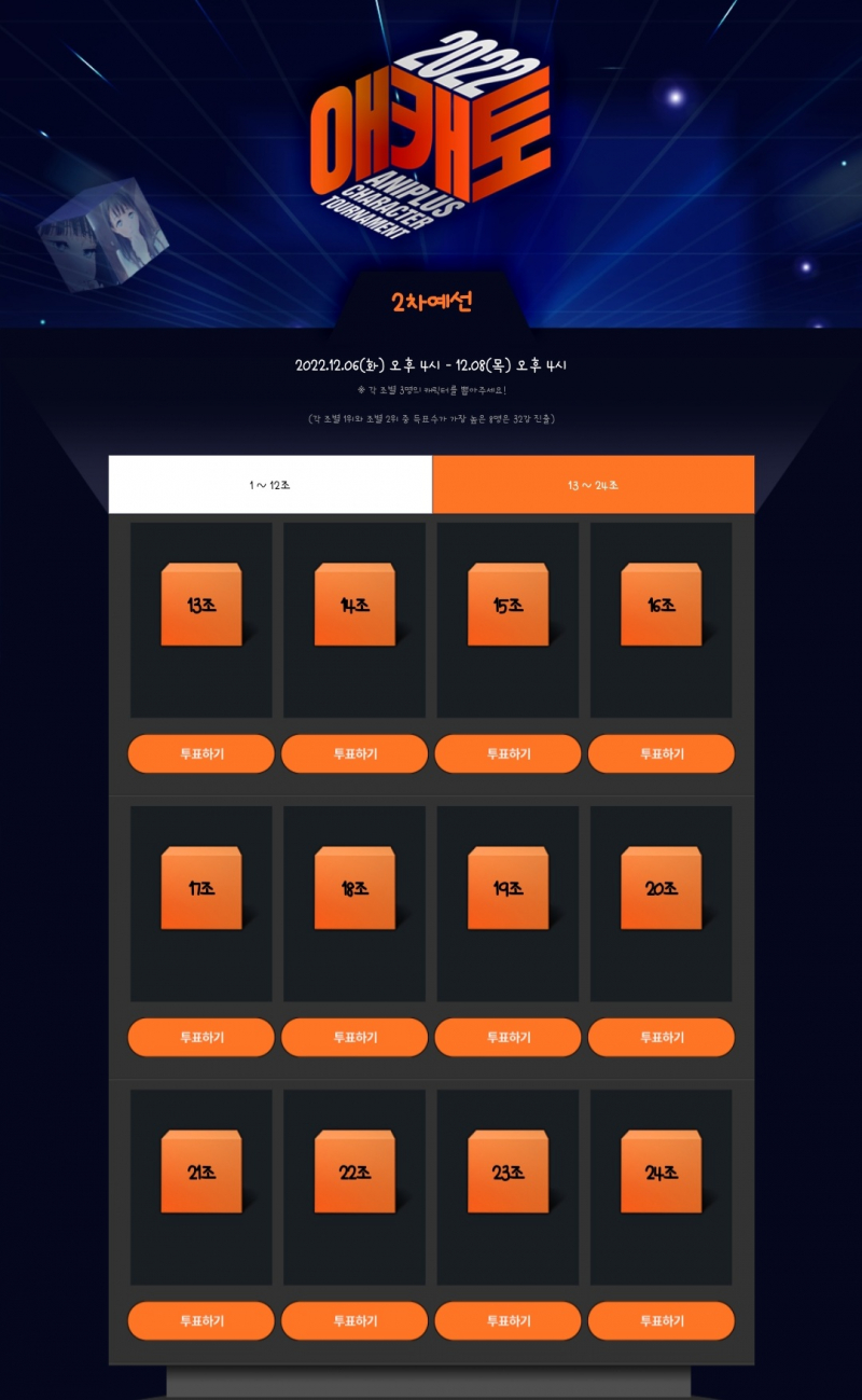 안달뷩 2022 애캐토 2차전 투표 결과~!!💕💕👍👍 [일반] 작성일시 : 2022. 12. 08 (16:15) 조회 : 1,660 / 댓글 : 10 오늘 오후 7시 32강전 조편성 시작~!!💕💕👍👍 출처(링크) : https://naver.me/5fjjD1nu 9추천 글쓰기스크랩 신고