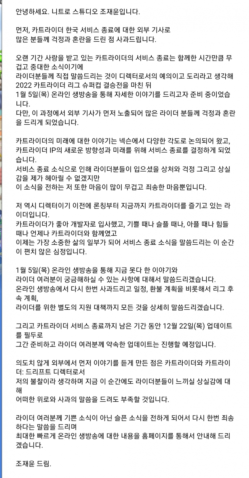 TMTonejae 이게 섭종이라니 [일반] 작성일시 : 2022. 12. 11 (16:17) 조회 : 1,749 / 댓글 : 17 기사를 통해 카트라이더 섭종 소식 떴는데결국 오피셜이었네요그래도 고마워서 후속작도 할려고 합니다요약하자면1. 원래 카트리그 슈퍼컵 결승전 끝나고2023년 1월 5일 온라인 라이브로 섭종 공지할 예정이었다2. 그러나 한 언론사 단독보도로 먼저 유출3. 그래서 유저들에게 사과와 함께어떤 표현으로도 위로 못해서 개발자로써마음이 무겁고 향후 관련 보상 및 계획 등을라이브로 공지 예정 7추천 글쓰기스크랩 신고