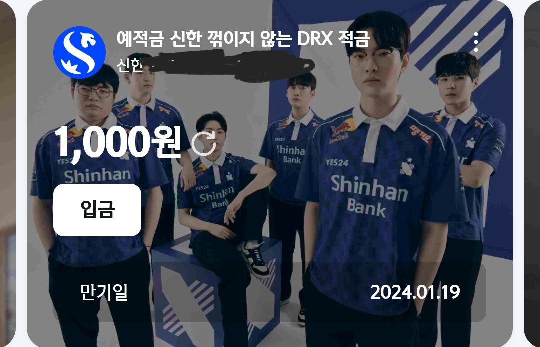 TMTonejae 중요한 건 꺾이지 않는 잔고 [일반] 작성일시 : 2023. 01. 19 (17:22) 조회 : 1,585 / 댓글 : 4 예전에 좋아하는 야구 구단 이름으로적금 넣어서 성적에 따라 이자를 주는 상품이화제였죠이번에 신한은행에서 e스포츠 적금이 나왔습니다작년 화제의 문장이었죠중요한 건 꺾이지 않는 마음을 활용한꺾이지 않는 DRX 적금입니다주로 이용하는 은행이고작년 여름 e스포츠 팀 DRX와 스폰서십을 맺어서바로 가입했습니다국내 대회 및 국제대회 성적에 따라또한 조기 가입 및 신한 체크카드 결제계좌가신한은행으로 설정한 경우추가 우대금리를 준다고 하네요적금도 이렇게 재미있게 하면덕질할 때 매우 좋겠네요 ㅎㅎ 5추천 글쓰기스크랩 신고