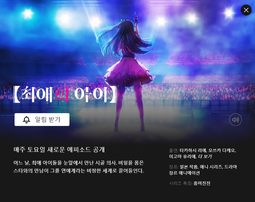 타카기 애니 "최애의 아이" 내일 5월 13일 넷플릭스 공개! [애니] 작성일시 : 2023. 05. 12 (16:00) 조회 : 1,868 / 댓글 : 4 드디어 최애의 아이가 넷플릭스에 공개 됩니다.역시, 인기작이라 그런지 빨리 나왔네요. 매주 토요일에 새로운 에피소드가 공개 된다고 합니다. 출처(링크) : https://www.netflix.com/kr/title/81684733 6추천 글쓰기스크랩 신고