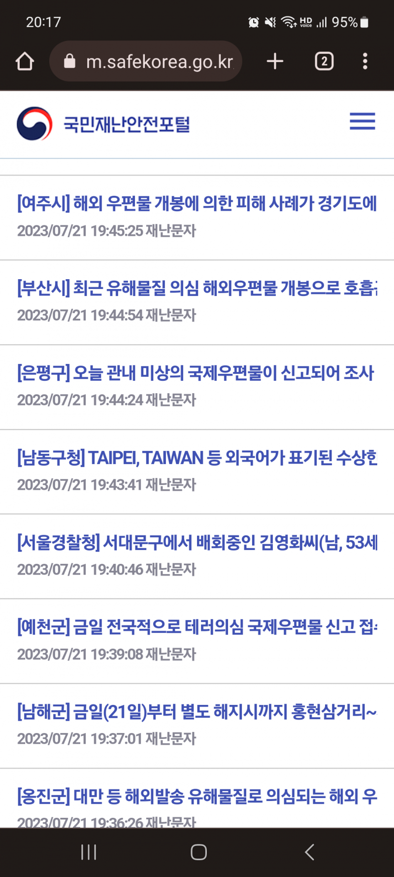 토모키 독극물 우편테러 조심하세요 [일반] 작성일시 : 2023. 07. 21 (20:18) 조회 : 1,689 / 댓글 : 5 재난문자 오네요 출처(링크) : https://m.safekorea.go.kr/idsiSFK/neo/main_m/dis/disasterDataList.html 5추천 글쓰기스크랩 신고
