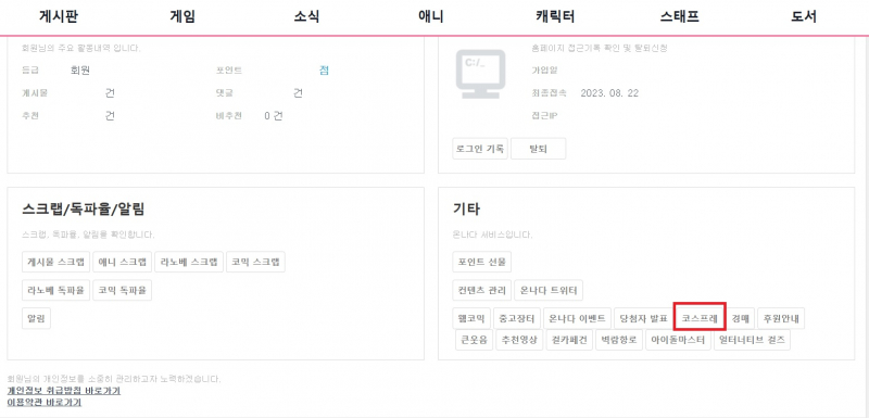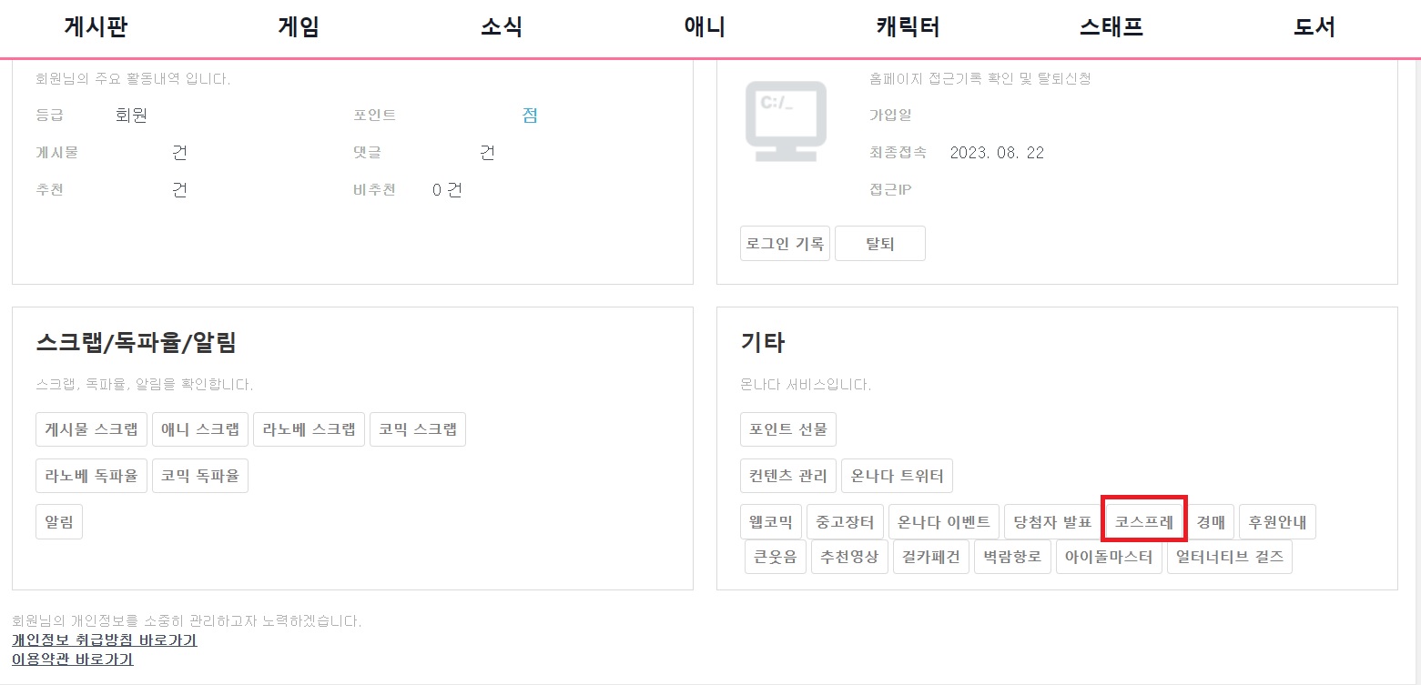 유희 코스프레 글은 이쪽에... [기타] 작성일시 : 2023. 08. 22 (00:48) 조회 : 1,554 / 댓글 : 5 구버전 온나다(PC용)에서 "내정보"에 보시면 저렇게 "코스프레" 버튼 보여요.코스프레 글은 저쪽에 올려주시면 됩니다.▼아래는 해당 코스프레 링크https://bbs2.onnada.com/cosplay 9추천 글쓰기스크랩 신고