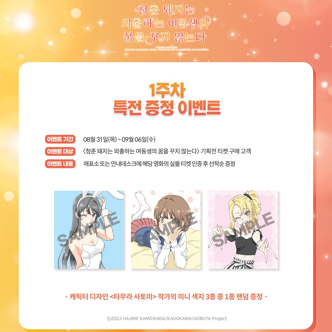 타카기 청춘 돼지는 외출하는 여동생의 꿈을 꾸지 않는다 1주차 특전 공개! [애니] 작성일시 : 2023. 08. 25 (12:44) 조회 : 1,988 / 댓글 : 5 캐릭터 디자인 "타무라 사토미" 님의 미니 색지 3종 중 1종 랜덤 증정!(왼쪽부터) 사쿠라지마 마이, 아즈사가와 카에데, 토요하마 노도카 1주차 특전 잘나왔군요. 아직 장소는 공개되지 않았지만, 기대가 됩니다. 2023년 8월 31일 메가박스에서 개봉!! 10추천 글쓰기스크랩 신고