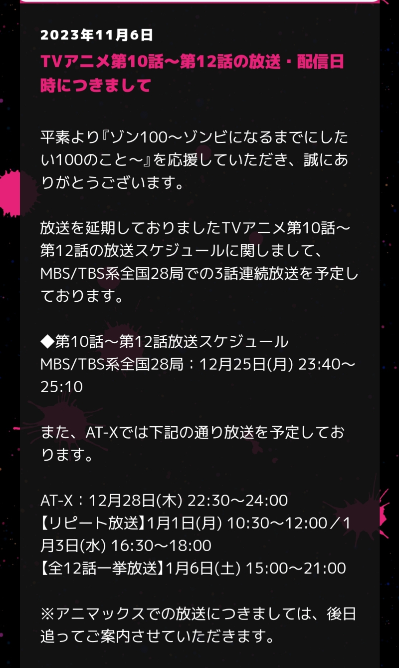 TMTonejae 좀100이 돌아옵니다 [애니] 작성일시 : 2023. 11. 06 (19:15) 조회 : 1,488 / 댓글 : 4 정말 말이 많았고 4분기 애니로 인해잊혀진 좀100 남은 10화 ~ 12화가12월 25일 크리스마스 날 3회 연속 방영하네요한국에선 애니맥스에서 했는데공개 시기는 추후에 공개 예정으로25일 ~ 24년 1월 초 정도 예상합니다과연 마무리는 어떨지 궁금하네요 6추천 글쓰기스크랩 신고