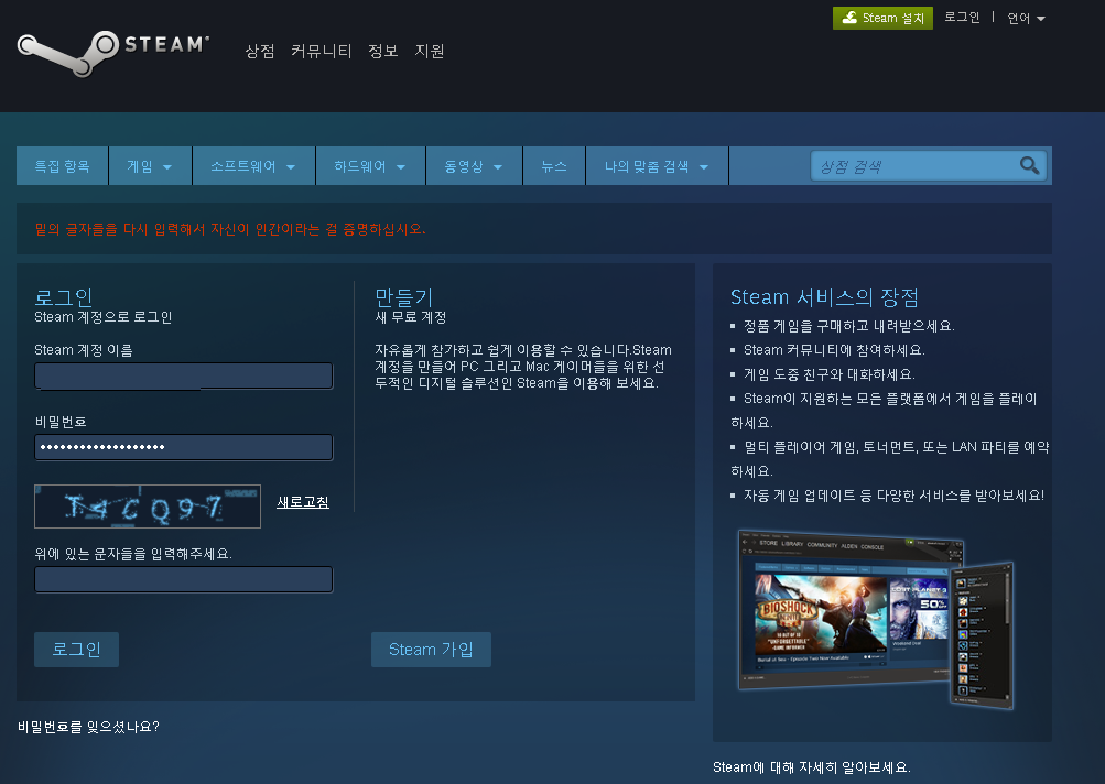 린스갓 스팀 로그인 보안문자 잘 못 쳤을 경우 [일반] 작성일시 : 2016. 06. 22 (20:06) 조회 : 1,340 / 댓글 : 2 밑의 글자들을 다시 입력해서 자신이 인간이라는 걸 증명하시오.스팀에서 림보(limbo)라는 게임이 무료이벤트 중이여서받으려니까 보안문자 틀렸더니 사람임을 증명하라네요 ㅂㄷㅂㄷ저 사람 맞아요... 아놔! 2추천 글쓰기스크랩 신고