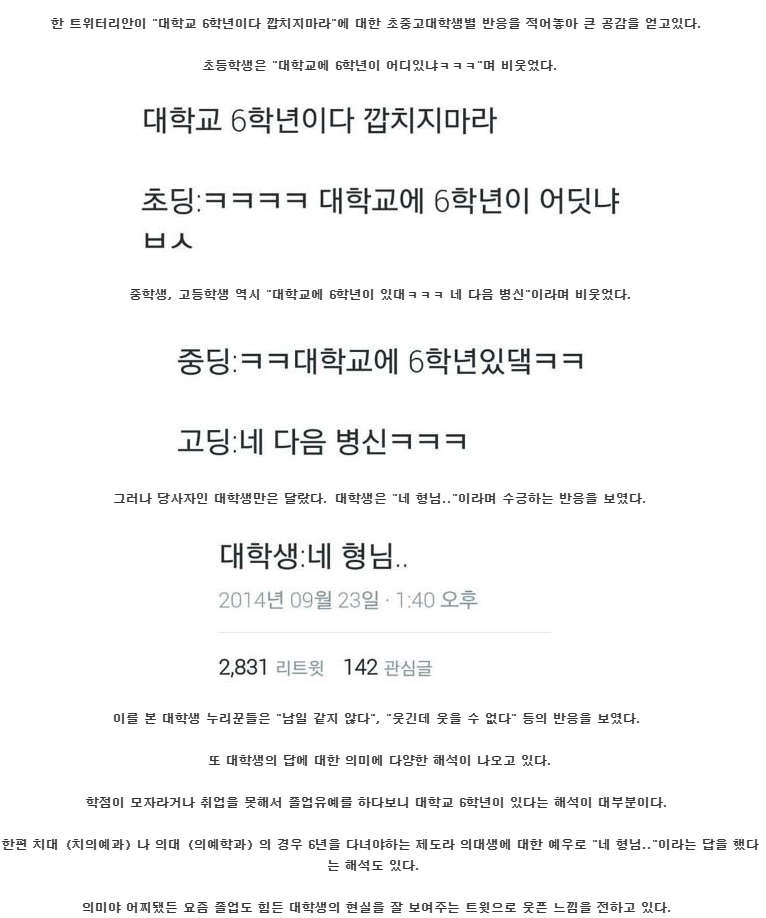 린스갓 대학교 6학년에 대한 초중고대학생 별 반응 [일반] 작성일시 : 2016. 07. 01 (14:38) 조회 : 2,924 / 댓글 : 1 출처(링크) : http://ma138.blog.me/220750793419 1추천 글쓰기스크랩 신고