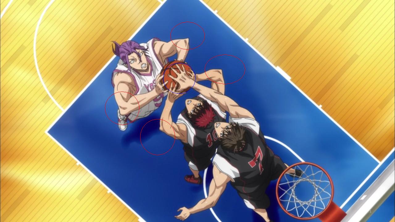 자 이 스샷에 파란색 동그라미를 보시면 키요시의 손이 카가미의 손등에 있지 않고... 공에 있습니다... 분명 직전에는 카가미의 손등을 밀어줬는데 말이지요..