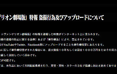 신 에반게리온 극장판 특보 영상을 촬영하여 인터넷에 올리지 말라고 공식측이 경고