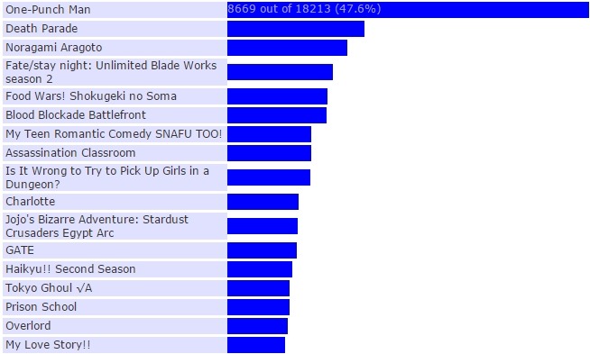 2015년에 방영된 TV애니를 대상으로 한사람당 5작품씩 투표를 받아서 진행되었고 결과가 발표되었습니다.