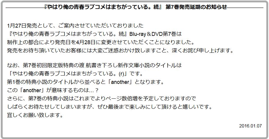 2016년 1월 27일에 발매될 예정이었던 '역시 내 청춘 러브코메디는 잘못됐다 속'