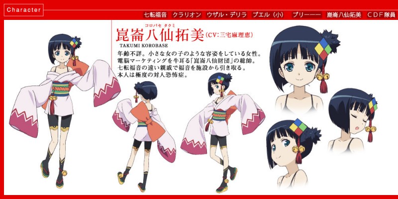 Teixeira [홍각의 판도라] 코로바세 타쿠미 설정화 [애니] 작성일시 : 2016. 01. 26 (19:01) 조회 : 3,399 / 댓글 : 0 코로바세 타쿠미 (CV 미야케 마리에) 연령 불명. 작은 여자 아이 같은 모습을 하고 있는 여성. 전뇌 마케팅을 좌지우지하는 <곤륜팔선재단> 의 총수. 나나코로비 네네의 먼 친척 아주머니로, 네네를 시설에서 데려와 떠맡았다. 본인은 극도의 대인 공포증을 앓고 있다. 출처(링크) : http://bbs2.ruliweb.daum.net/gaia/do/ruliweb/family/1360/read?articleId=1969128&bbsId=G003&itemId=15&pageIndex=1 1추천 글쓰기스크랩 신고