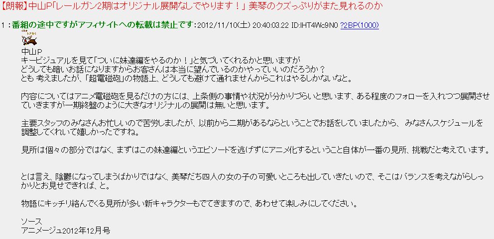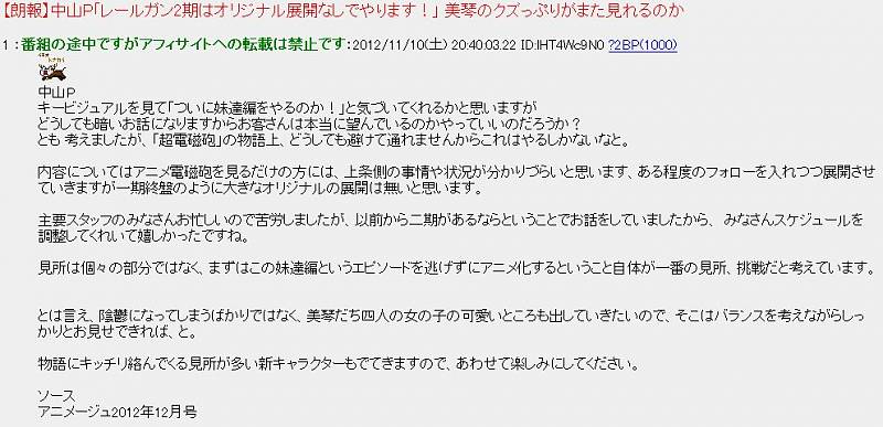 아니메쥬 12월호에 실린 '어떤 과학의 초전자포' 2기 관련 기사가 2ch에서 화제인 모양입