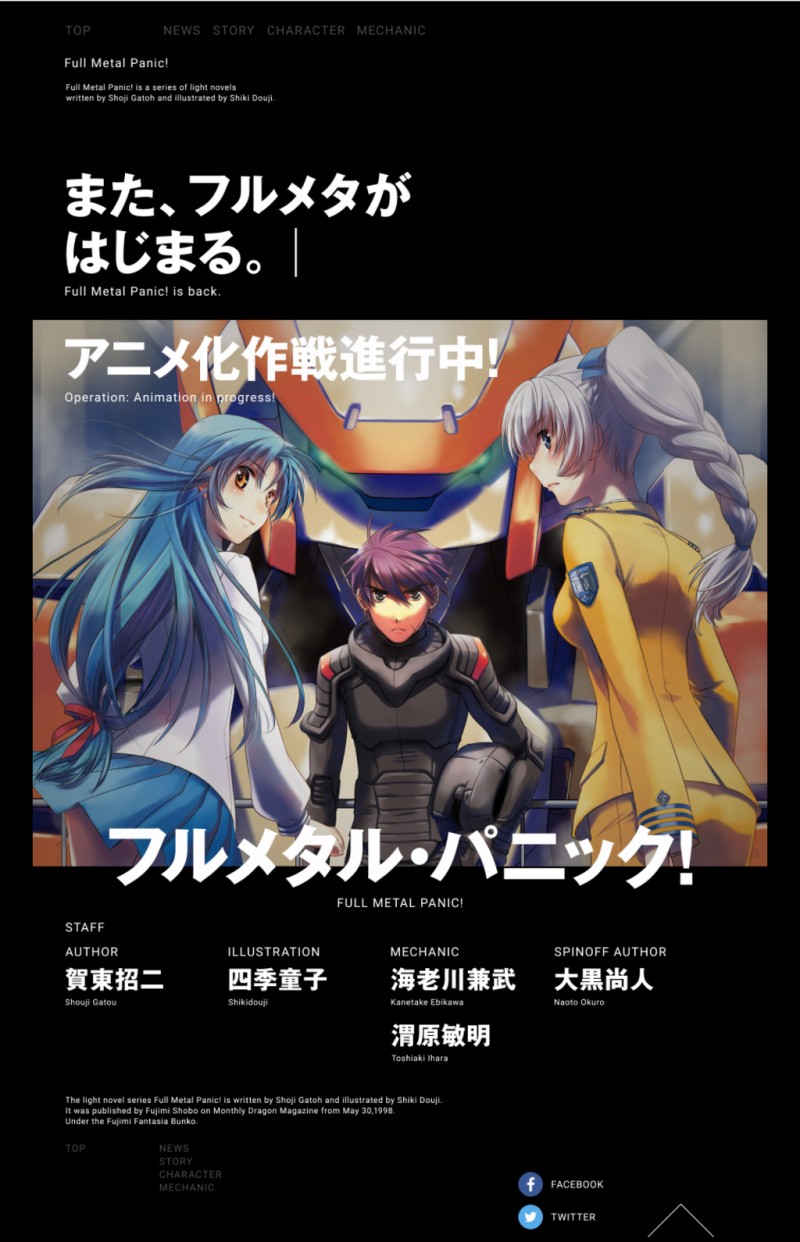 Teixeira [풀 메탈 패닉] 스페셜 사이트 공개 [애니] 작성일시 : 2016. 02. 19 (19:22) 조회 : 2,115 / 댓글 : 0 http://fullmetal-panic.jp/ 출처(링크) : http://bbs2.ruliweb.daum.net/gaia/do/ruliweb/default/news/521/read?articleId=1989962&bbsId=G003&itemGroupId=28&pageIndex=1 0추천 글쓰기스크랩 신고