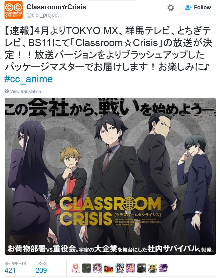 TV 애니메이션 '클래스룸 크라이시스'가 2016년 4월 1일부터 매주 금요일