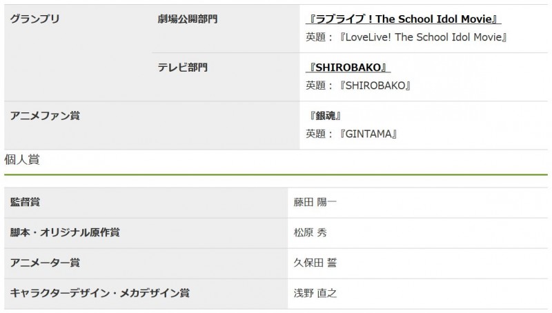 그 결과 극장판 애니메이션 부문에서는 '러브라이브' 극장판이, TV 애니메이