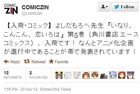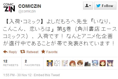 세희 만화 '이나리, 콘콘, 코이이로하' 애니메이션화 기획 진행중 [애니] 작성일시 : 2012. 12. 07 (17:11) 조회 : 5,017 / 댓글 : 0 12월 1일에 발매되는 만화가 '요시다 모로헤' 선생의 만화 작품 '이나리, 콘콘, 코이이로하' (いなり、こんこん、恋いろは) 코믹스 단행본 제 5권의 띠지에 애니메이션화 기획 진행중이라는 정보가 쓰여 있더라는 얘기가 올라와 화제가 되는 모양입니다. 잘 모르는 작품이라 검색해 보니, 로맨틱 코메디물이며, 신으로부터 다양하게 변신할 수 있는 능력을 받은 여중생의 이야기라고 하는데요. 과연 언제 어떤 식으로 애니메이션화 될지 궁금합니다. 출처(링크) : http://alonestar.egloos.com/4758817 0추천 글쓰기스크랩 신고