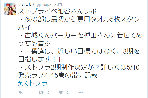 샤이넨후작 스트라이크 더 블러드, 3기를 목표로 하고있다 [애니] 작성일시 : 2016. 04. 10 (21:46) 조회 : 3,120 / 댓글 : 3 스트라이크 더 블러드 이벤트 中 - 호소야 요시마사 (아카츠키 코죠役)우리는 눈앞의 목표가 아닌 3기를 목표로 하고 있습니다.• 5월 10일 발매되는 원작 라이트노벨 15권에서 중대 발표가 있을 예정(3기 까지 만들건가봅니다 와..) 출처(링크) : http://bbs2.ruliweb.daum.net/gaia/do/ruliweb/family/1360/read?articleId=2036243&bbsId=G003&itemId=15&pageIndex=1 0추천 글쓰기스크랩 신고