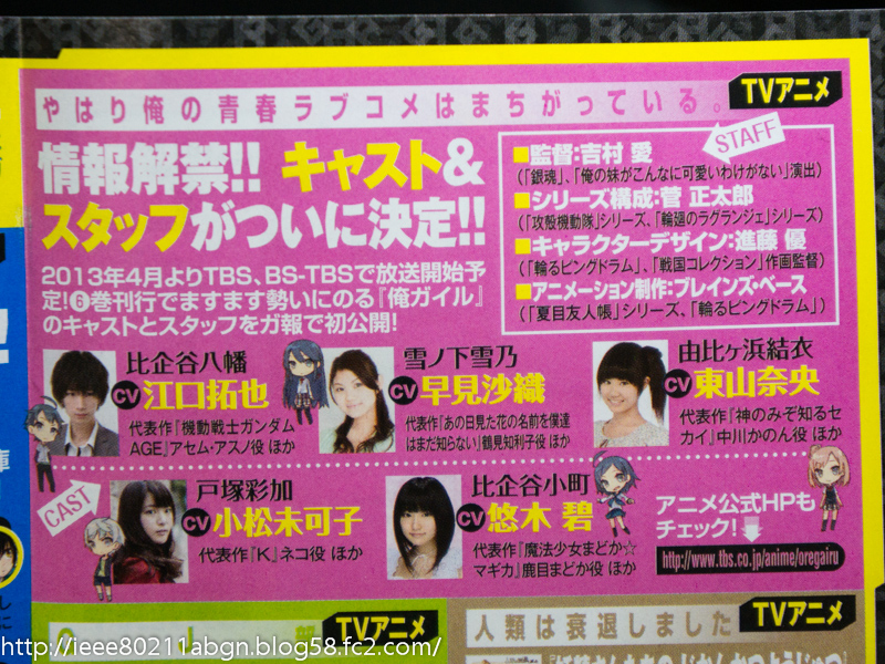 2013년 4월 신작 '역시 내 청춘 러브 코미디는 잘못됐다' 주요 제작진 및 성우진