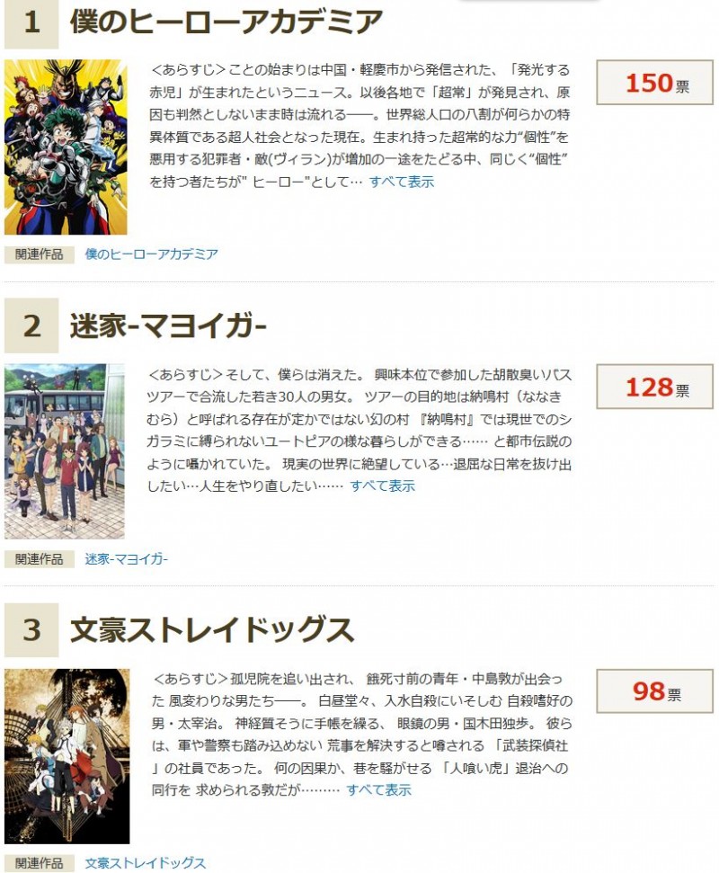 2016년 봄 애니메이션 가운데 실망한 애니메이션 랭킹 앙케이트 결과