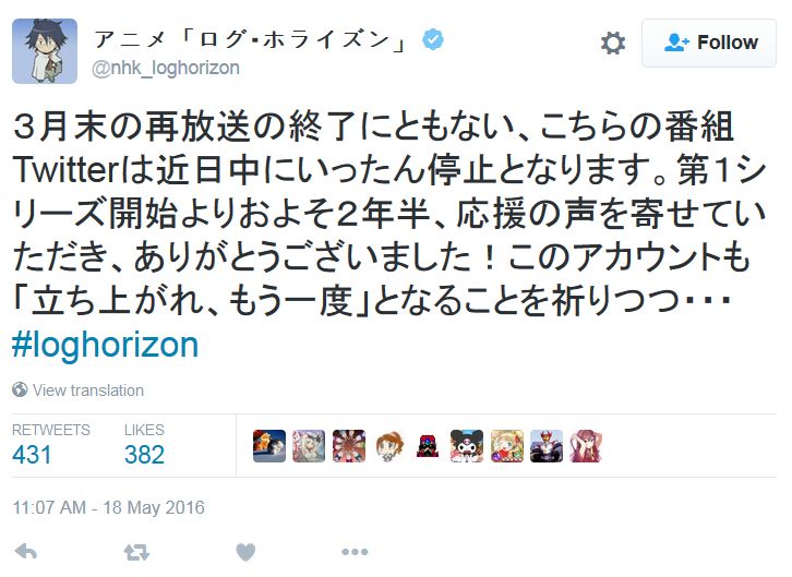 애니메이션 '로그 호라이즌' 공식 트위터 계정 조만간 일단 정지