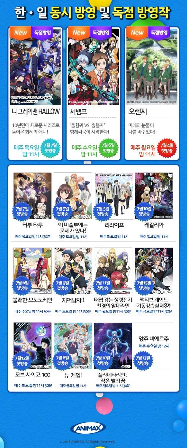 어느새 우리나라 애니맥스 채널의 2016년 7월 동시 방영 신작 애니메이션