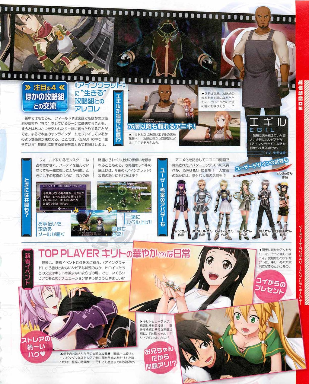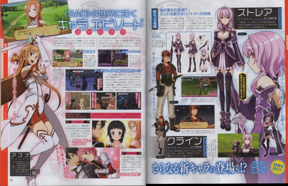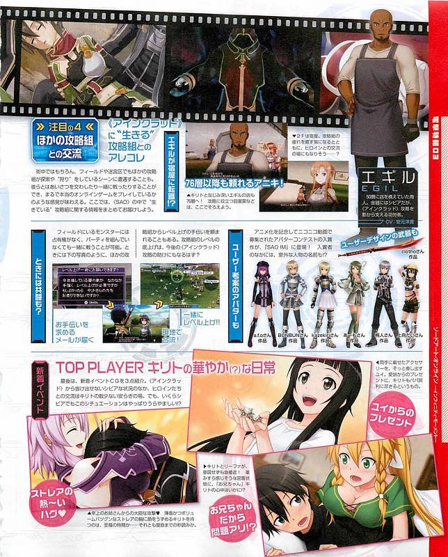 게임에서 시논은 자기가 왜 여기 있는지도 기억하지 못한 채 76층 이후에서 등장하며, 자신의 이름과 일상적인 것을 제외한 기억을 잃어버린 상태랍니다. 또한 SAO에서는 유일하게 원거리 무기인 활을 사용한다고 하네요. 성우는 드라마 CD와 마찬가지로 사와시로 미유키씨. 기대해 보겠습니다. (그나저나 사진 속에서 키리토는 변함없이 즐거워 보이네요.)