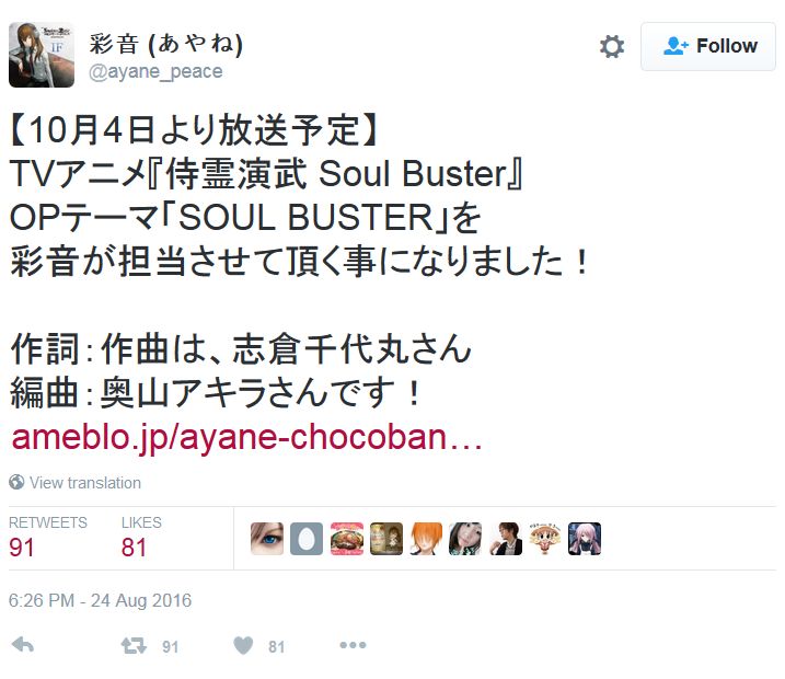의 오프닝 테마곡 'SOUL BUSTER'를 '아야네'씨가 담당한다고 합니다. 엔딩