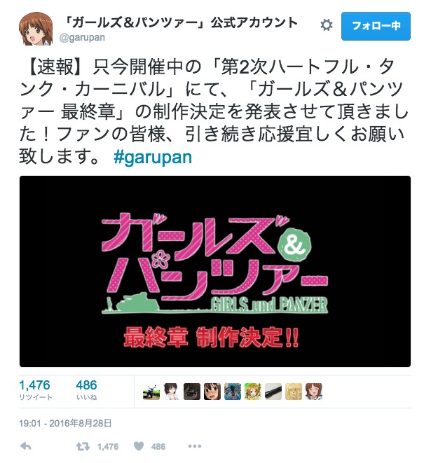 샤이넨후작 걸즈&판처 최종장 제작 결정 [애니] 작성일시 : 2016. 08. 28 (19:42) 조회 : 2,225 / 댓글 : 0 현재 개최 중인 행사 「제2차 하트풀・탱크・카니발」에서 발표 되었다고합니다- . 출처(링크) : http://bbs.ruliweb.com/family/211/board/300015/read/2107970? 2추천 글쓰기스크랩 신고
