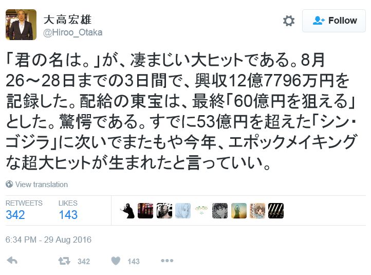 극장 애니메이션 '너의 이름은'이 사흘간 흥행 수입 12억 7796만엔 기록